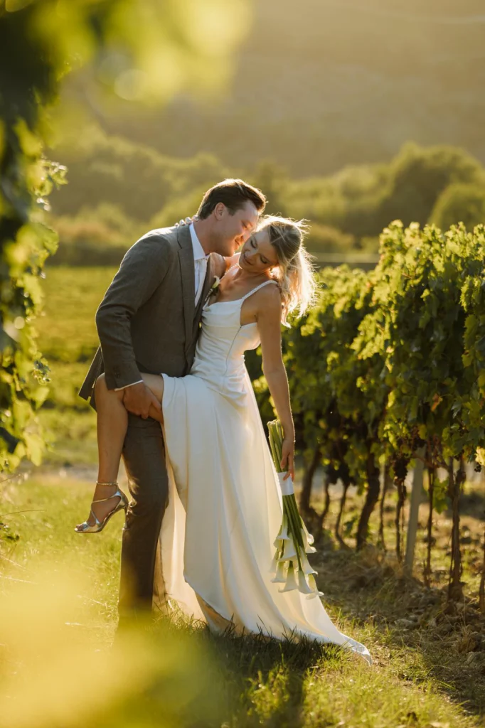 Op de locatie van Maaike & Maarten vond je alles wat een bruiloft hier zo perfect maakt; uitgestrekte wijngaarden die bijna oneindig leken, eeuwenoude olijfbomen, dat zachte, warme gouden licht, aangevuld met sfeervolle string lights die ’s avonds alles in een intieme glow zetten. (love it!)