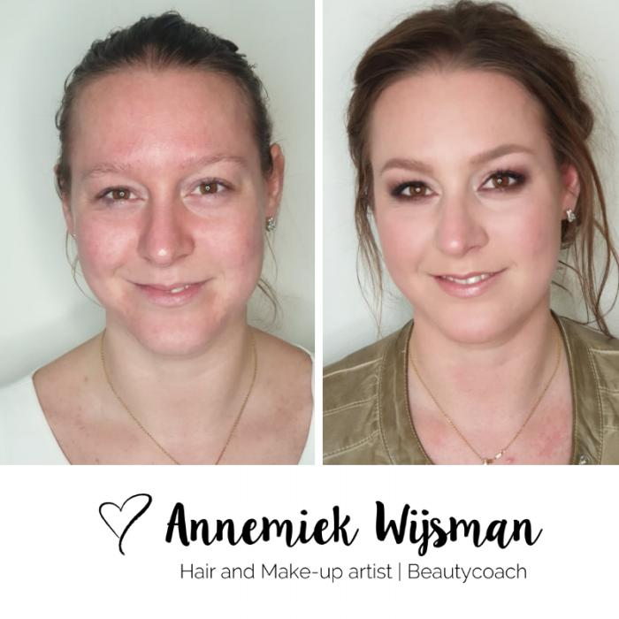 “21 augustus 2020 was het zover! Keurig op tijd troffen wij, bruid en bruidegom, Annemiek in een hotelkamer nabij onze trouwlocatie. We zijn in contact gekomen met Annemiek op aanraden van onze fotograaf. En wat had hij gelijk! Annemiek is een vakvrouw. Naast professionaliteit weet ze ook humor en steun aan de dag te leggen. Als bruid was ik megatrots op de look van mijn make up en haar! Door de dag heen heeft Annemiek met regelmaat mijn look bijgewerkt en “fris” gehouden! Naast alle complimenten van vrienden en familie moet gezegd worden dat de foto’s fantastisch zijn geworden. Niet in de laatste plaats door de ‘kunstenares’ Annemiek!”